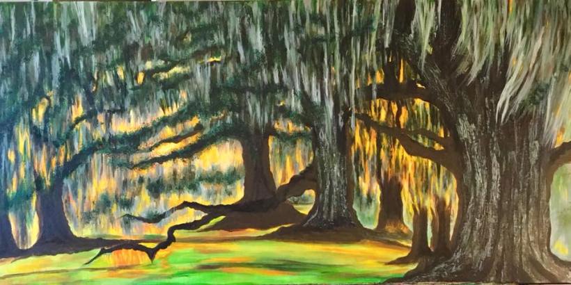 This is from a photograph by an old friend and accomplished photographer, Colleen Kerrigan. These are live oaks along the shore of the Gulf of Mexico in Pass Christian, Mississippi. Live oaks are evergreen and don’t lose their leaves so they look like this always! They can live for hundreds of years and the old ones are huge and majestic. This now lives in the home of some family members.