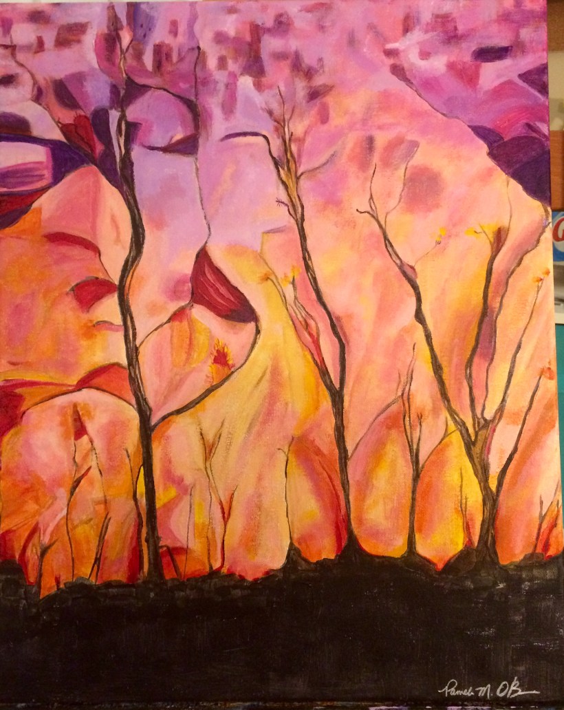 This was inspired by a stunning photograph by Ohio artist and photographer Shannon Godby. He was gracious enough to give me permission to use his photograph, although he does a lot of his own paintings from his own photos. I like the drama of the sky against the stark bare trees. It was fun to play with those trees. This is now living at my old friend David Rockhold’s metal art studio.