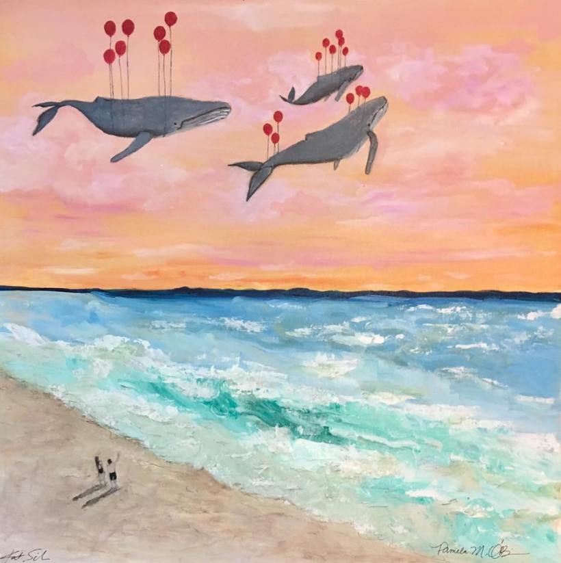 I did the background for this: the water, the sky and the beach itself. Kat added the floating whales and the people on the beach looking up at them. I love this painting, but didn’t realize until last night that it could be about death. I wasn’t consciously thinking about my father’s death when I painted this, but there it is. It’s eternally fascinating to me how art brings to the surface things that are floating around in your mind.
