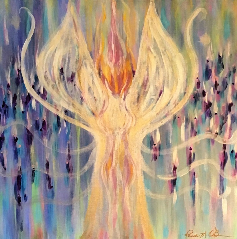 I did this piece because I was having a hard time with the idea that I don’t know where my father is. That may sound a little strange, but for some reason, it’s been the hardest thing for me to accept about his death. I did a smaller version of it on paper for the Intuitive Abstract Painting Workshop I led at Acceleration Art and Photography Gallery. I’d love to hear from you about what you see in this. I’ve found some whimsical aspects.