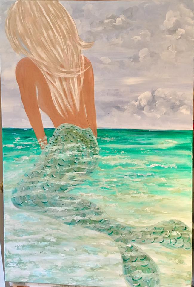 I’ve always been fascinated with mermaids. I love the beach, although most beach themed decor bores me silly. I decided to paint my own mermaid for my bathroom, which is my safe haven after a long day. Here she is, shimmering in the surf.